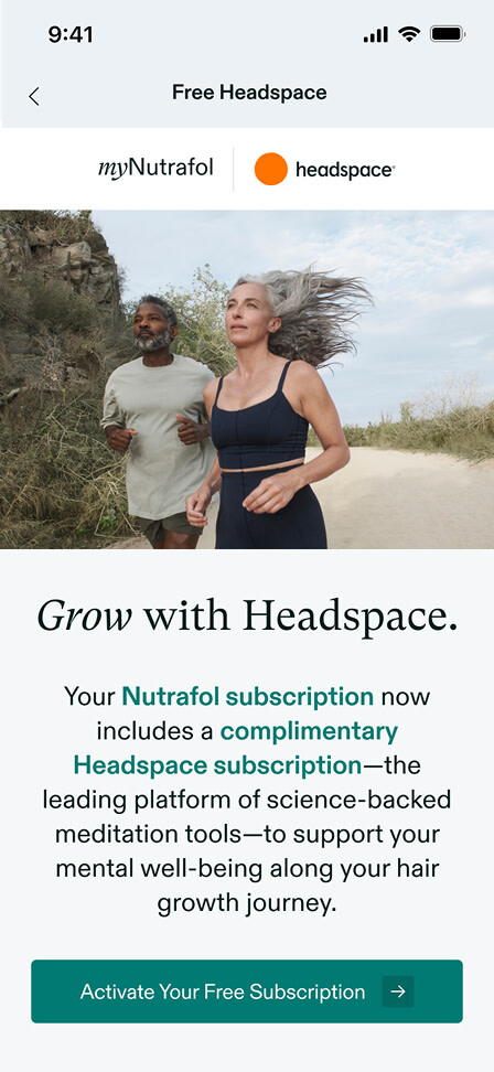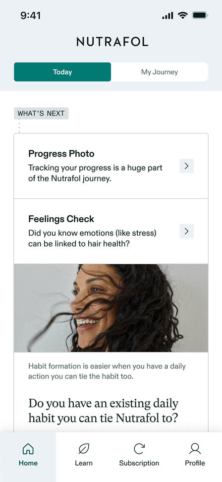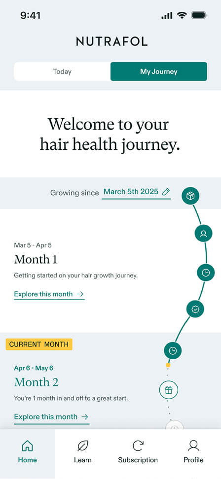 The myNutrafol app is available for both iOS and Android devices. Requires iOS 14 or later, or Android 11 or later. By downloading this app, you agree to our Privacy Policy and Terms of Use.