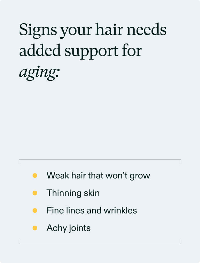 By age 30, collagen and elastin begin breaking down. This can result in thin, dry, weak hair that breaks more frequently. You may even notice your hair can’t grow as long as it once could. If you are experiencing these signs, aging may be a prominent root cause of your hair thinning. Take our quiz to find out.